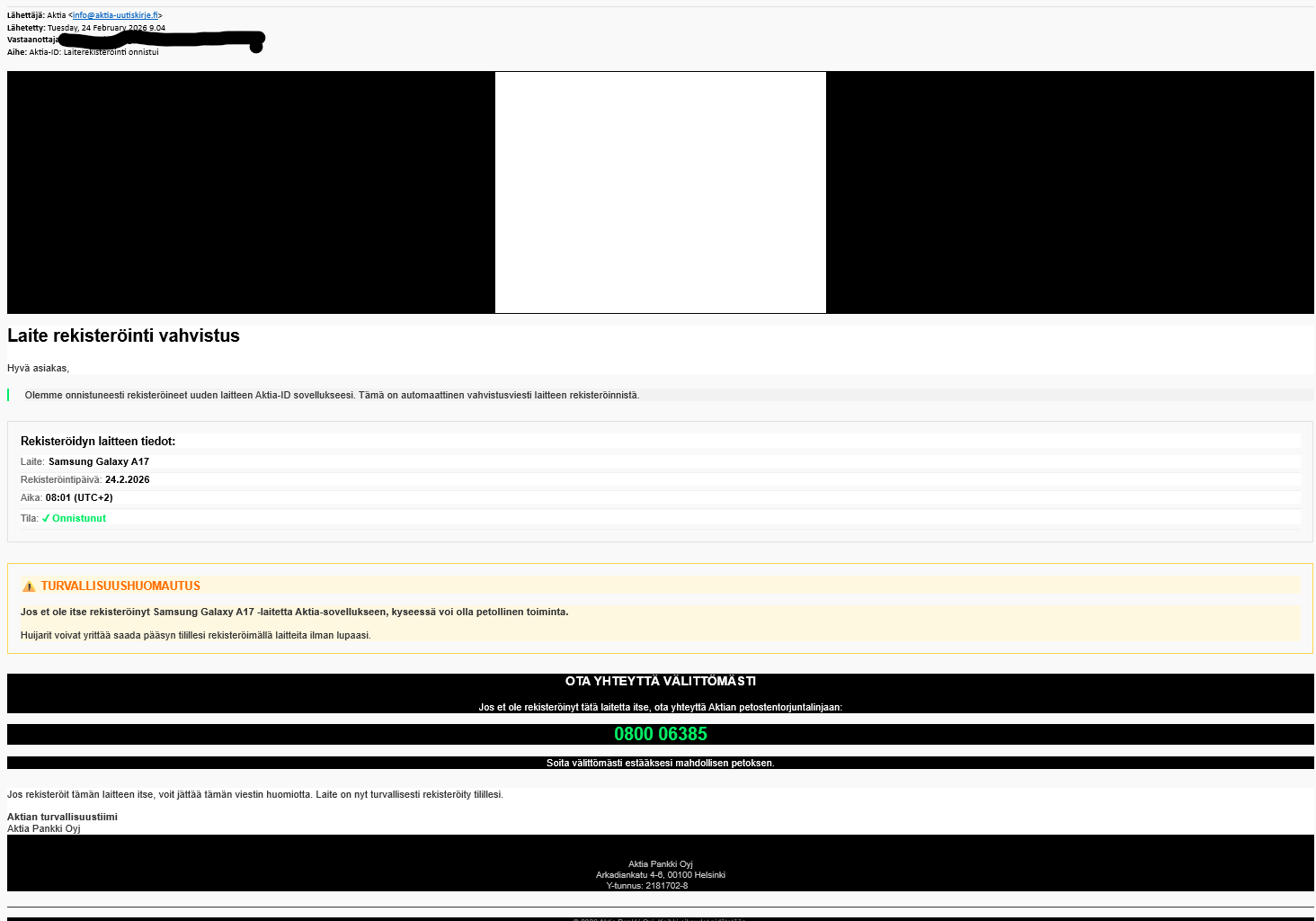 Det skickas förfalskade e‑postmeddelanden i Aktias namn med information om registreringen av en ny enhet i Aktia ID. I meddelandet finns även ett förfalskat nummer till Aktias bedrägeribekämpningslinje. Ring inte numret i meddelandet. Aktia har endast en servicelinje för personer som fallit offer för bedrägerier. Linjen betjänar privatkunder vardagar kl. 8–18 på numret 010 247 010, val 5.